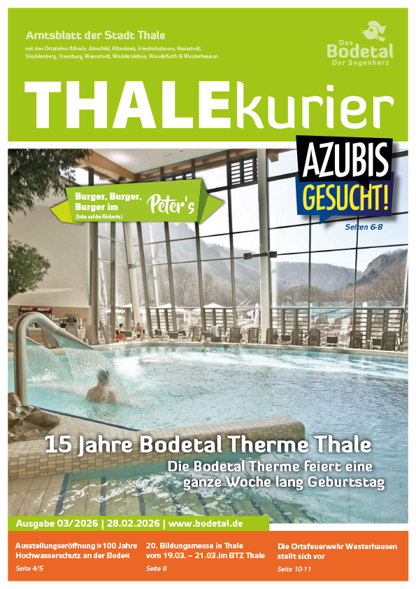 Der THALEkurier ist das offizielle Amtsblatt der Stadt Thale und seiner Ortsteile. Neben den amtlichen Bekanntmachungen enthält das monatlich erscheinende und als Stadtmagazin angelegte Heft auch zahlreiche aktuelle Informationen und Veranstaltungstipps für das Bodetal.